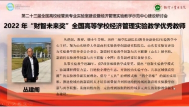 本次会议对2022年度实验教学优秀教师和管理者进行了表彰。我校新商科实验教学创新研究院院长、中心原主任丛建阁教授荣获“财智未来奖”,并代表获奖教师发言。丛建阁主任对经管学科组和广大同仁的认可鼓励表示了衷心感谢,对多年从事实验教学及管理工作的感受进行了动情分享,认为实验教学需要一种情怀,要有默默坚守的归属之心,要有与时俱进的开拓之情,要有协同发展的共生之怀,要有立德树人的担当之德,希望所有坚守实验教学的同仁们继续努力,共同推动我国高等教育的“四新”建设和双一流建设取得更大、更好的成绩。