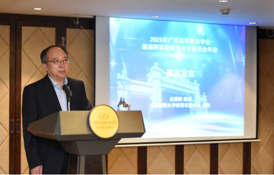 11月21日,2021年广西高等教育学会新商科实验教学专业委员会年会在广西大学举行。广西高等教育学会杨伟嘉会长、广西大学冯家勋副校长到会致辞,高等学校国家级实验教学示范中心联席会经济与管理学科组组长、山东大学商学院院长戚桂杰发表视频致辞。来自全区17所高校的经济管理类学院、实验中心负责人50余人参会。我中心主任、新商科实验教学创新与共享联盟(山东)秘书长丛建阁教授,湖北经济学院实验教学中心副主任、新商科实验教学创新与共享联盟(湖北)秘书长毛志斌教授作为特邀代表参加会议。