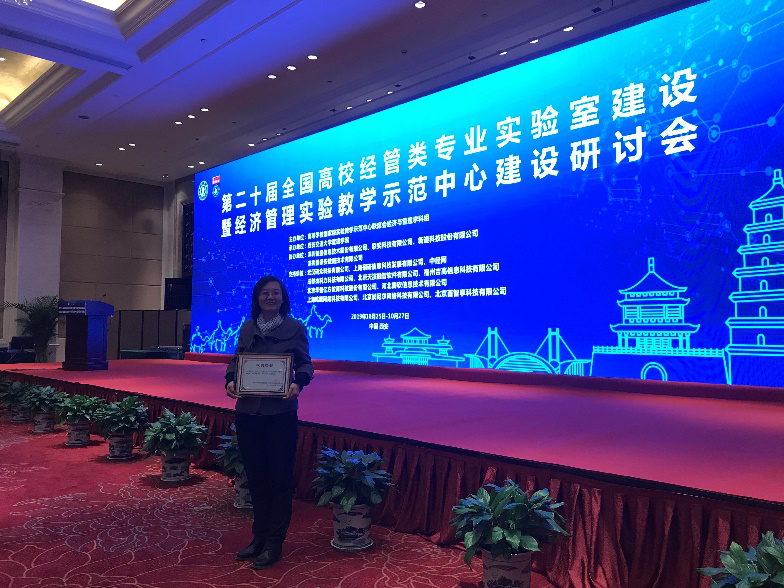 10月26-27日,由国家级实验教学示范中心联席会经管学科组主办、西安交通大学管理学院承办的“第二十届全国高校经管类专业实验室建设暨经济管理实验教学示范中心建设研讨会”在西安举行。经学校推荐,学科组专家评选,我校保险学院付红副教授因其突出的实验教学业绩荣获“智盛奖教金”优秀实验教师称号;作为对历届会议工作的回顾和总结,经管学科组在本届年会设立“突出贡献奖”,实验教学中心丛建阁主任因其长期以来积极组织、协调各级各类经管实验教学活动而获此殊荣。会上进行了2019年“智盛奖教金”(经济学类)、“联奕奖教金”(管理学类)和“卓越贡献奖”、“突出贡献奖”颁奖仪式。